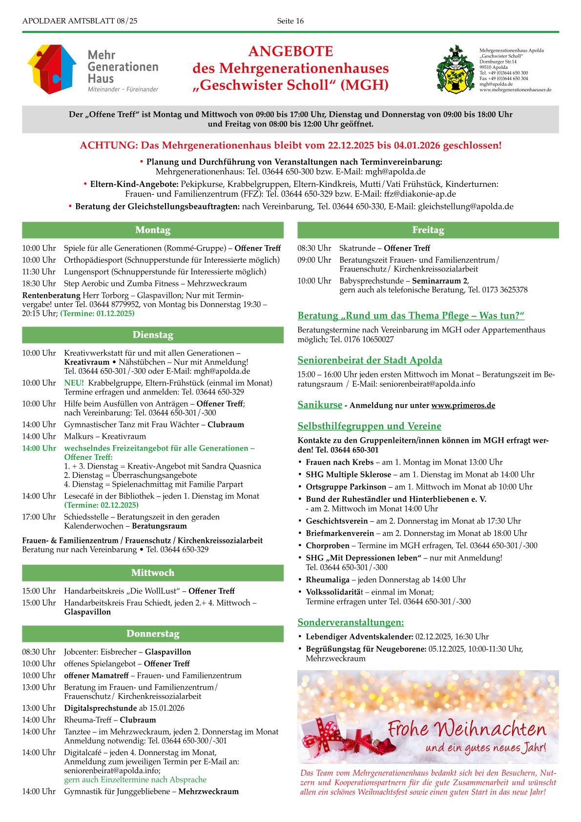 - Gleichstellungsbeauftragte: Termin nach Vereinbarung Tel. 03644 650-330 oder E-Mail: gleichstellung(@)apolda.de