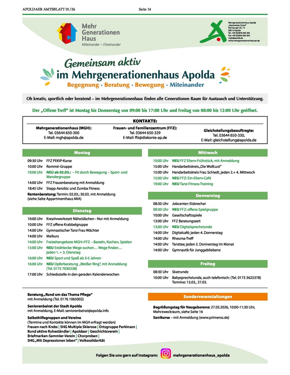 - Eltern-Kind-Angebote, z. B. Pekip-Kurse, Krabbelgruppen, Kinderturnen, Frühstücksrunden: Frauen- und Familienzentrum, Tel. 03644 650-329 oder E-Mail: ffz(@)diakonie-ap.de